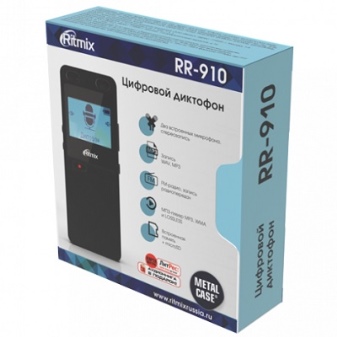 - Ritmix RR-910. Устройство недорогое, но удобное, наверное, в данном рейтинге это самый компромиссный вариант, если особенно тратиться на диктофон не хочется. Из его достоинств – металлический корпус Hi-Tech, а еще LCD-дисплей, голосовое включение и таймер, индикация времени записи, 2 микрофона высокого качества, емкостный съемный аккумулятор. А также в нем есть FM-радио, возможность использовать гаджет в качестве музыкального плеера и флешки. И явных недостатков прибор не имеет. Произведен в Китае.