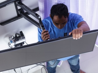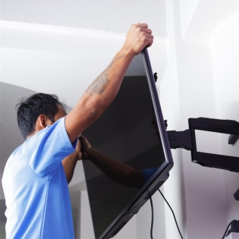 Категорически нельзя подвешивать старые кинескопные телевизоры. Из-за больших габаритов центр тяжести устройства может перемещаться, и кронштейн перекосится, отчего не исключается падение техники. Место старых телевизоров с кинескопом – на напольном (не настенном) шкафу, а также на подставке типа тумбы. Ультратонкий монитор благодаря малому (не более 3 кг) весу вообще не нуждается в кронштейне, для него подойдёт и простой настольный штатив, в т. ч. и моторизированный и такой же тонкий, как и сам гаджет.